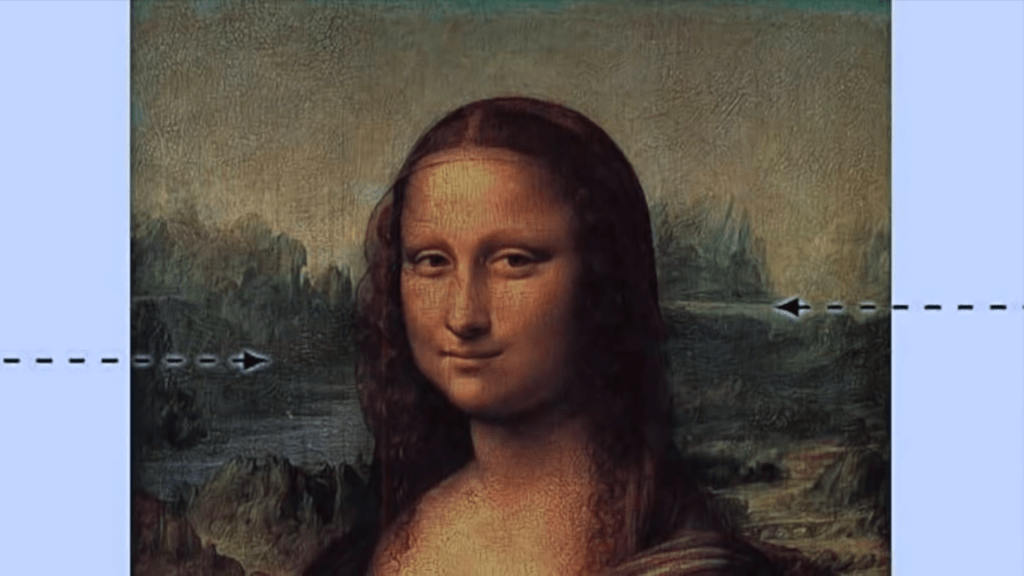 If you look at Mona Lisa’s eyes you see they are staring at you, but women in paintings never did that. The background of any other portrait has a simple background of either an open sky or a room but the background of the Mona Lisa is a complex aerial perspective of a landscape. The curves of her hair and clothing reflect the valleys and river flowing connecting humanity and nature. If you look at the background and compare the horizons on both sides you see it is not lined up. This visual trick gives an illusion of movement.