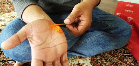 The chief ingredients required for Rogan painting are castor oil, wood, kerosene oil and dyes. The first step in the painting is the preparation of Rogan paste.