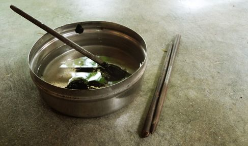 After preparing a furnace and selecting a suitable aluminium container, the local craftsmen boil a litre of castor oil for a minimum of four hours. The time required for boiling may vary depending upon the quantity of the oil taken. Then, they continuously stir the oil until it is time to remove the container from the furnace to let it cool down. While boiling, the castor oil may catch fire, after which it is immediately taken out and covered with a lid. During this, the impurities present in the oil gets thrown out in the form of fumes. This process is repeated several times until the oil forms a thick, gelatin-like consistency and turns yellowish.