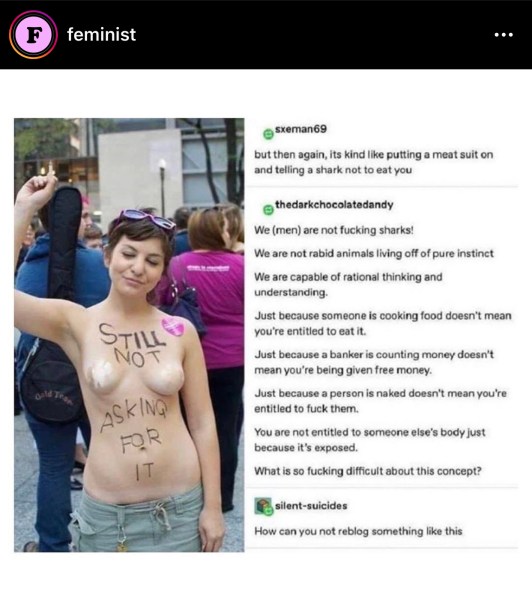 This post struck a nerve that no other post ever did. Mainly because whoever this person (thedarkchocolatedandy) is, didn’t insult anyone, nor did they try to persuade anyone to believe them. All they did was point out how humans are different than animals and also that women aren’t a piece of meat.