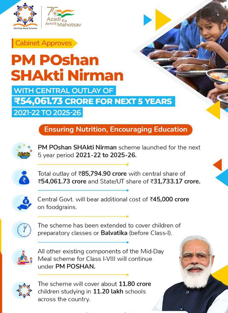 During the celebration of India’s 75th Independence Day as Azadi Ka Amrit Mahotsav, the Cabinet approved for the implementation of PM POSHAN SHAKTI NIRMAN for next 5 years i.e. 2021-22 to 2025-26.