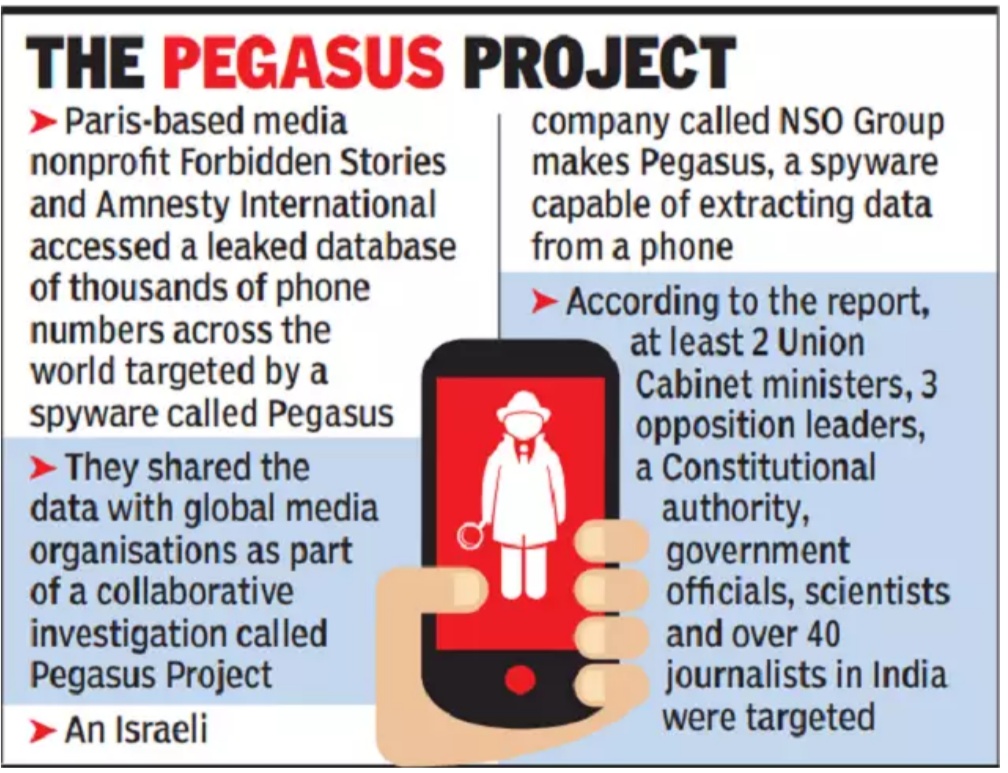 A leak of a list of over 50,000 phone numbers believed to have been identified as those of people of interest by clients of NSO since 2016 became available to Paris-based media nonprofit organisation Forbidden Stories and Amnesty International. They shared the information with seventeen news media organisations in what has been called “Project Pegasus”, and a months-long investigation was carried out, which reported from mid-July 2021. A total of 300 Phone numbers including that of Indian ministers, opposition leaders, ex-election commissioners and journalists were allegedly found on a database of NSO hacking targets by Project Pegasus in mid July. Independent digital forensic analysis conducted on 10 Indian phones whose numbers were present in the data showed signs of either an attempted or successful Pegasus hack. The results of the forensic analysis threw up shows sequential correlations between the time and date a phone number is entered in the list and the beginning of surveillance. The gap usually ranges between a few minutes and a couple of hours. 11 phone numbers associated with a female employee of the Supreme Court of India and her immediate family, who accused the former Chief Justice of India, Ranjan Gogoi, of sexual harrasment, are also allegedly found on a database indicating possibility of their phones being snooped. However, the crucial investigations are still being carried forward by officials.