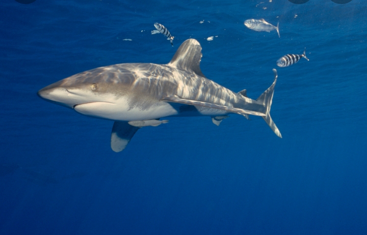 The oceanic whitetip shark ( Carcharhinus longimanus) also known as brown shark, lesser white shark. Its length ranges from 3.4m to 5m or 11ft to 13ft and its weight goes upto 167kg. It is aggressive towards humans. They are known to have attacked many survivor of ships.