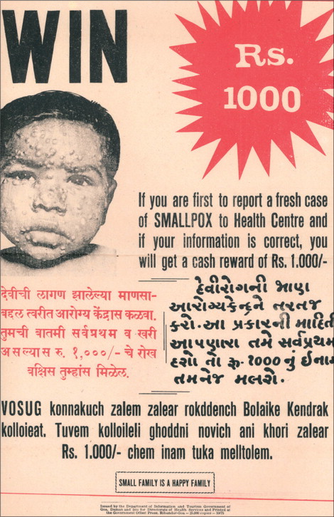 The Indian Government put full force in the National Smallpox Eradication Program. A prize of 1000 rupees for reporting new cases of pox was the most unique but highly successful strategy implemented. The general public reported 11% of outbreaks of smallpox in 1975, as compared with 2.6% in 1973. To encourage vaccination, posters were crafted in native languages, showcasing young children.