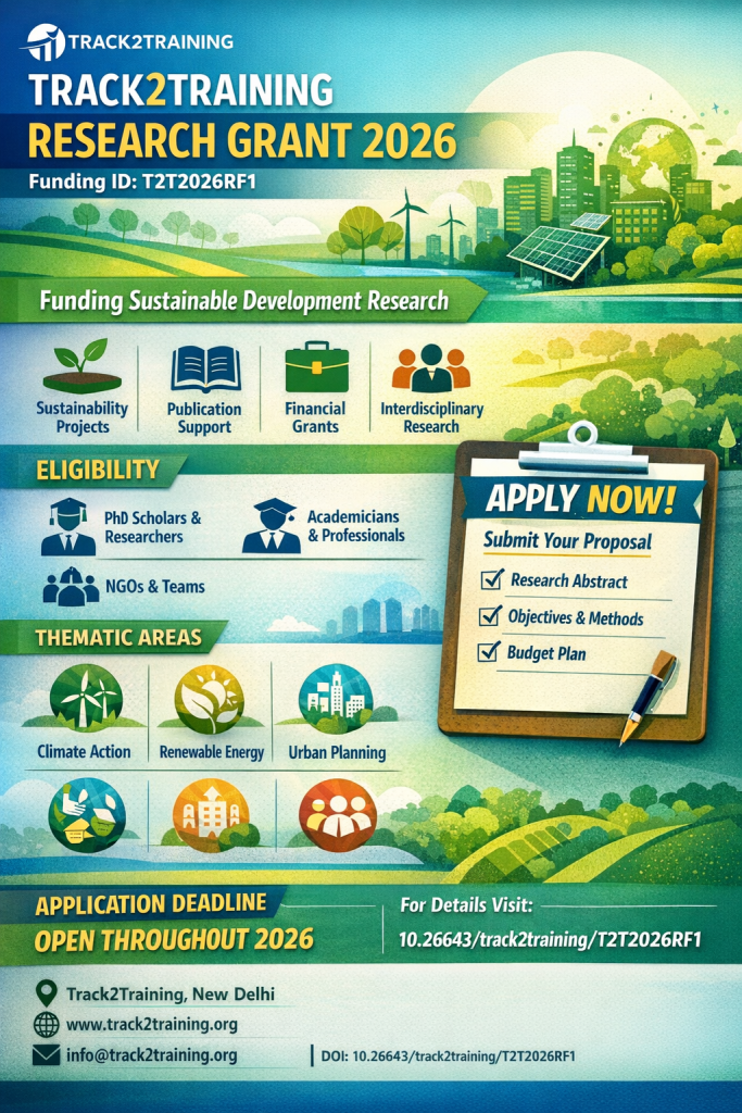 The Track2Training Research Grant 2026 (T2T2026RF1) is a prestigious funding initiative designed to promote high-quality research in the domain of sustainable development and allied interdisciplinary fields. Sponsored by Track2Training, New Delhi, this grant aims to support scholars, researchers, academicians, and professionals working toward innovative solutions aligned with global sustainability goals.